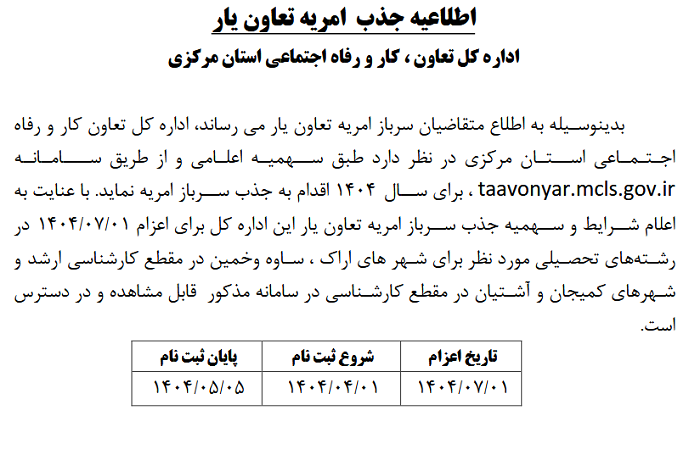 اطلاعیه جذب امریه تعاون یار ۱۱ تیر ۱۴۰۴ | ۱۲:۰۴ کد : ۵۲۷۴۸ اطلاعیه ارسال به دیگران نام شما ایمیل شما ایمیل دریافتکننده ارسال انصراف تعداد بازدید:۱۱۸۷ اطلاعیه جذب امریه تعاون یار