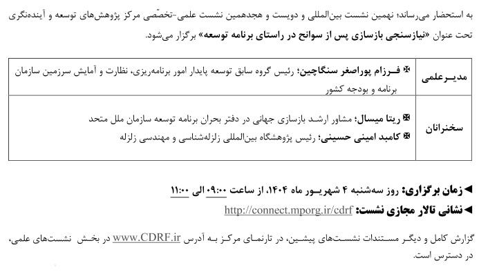 نشست علمی نیاز سنجی بازسازی سوانح در راستای برنامه توسعه ۰۳ شهریور ۱۴۰۴ | ۱۲:۳۷ کد : ۵۴۰۰۰ اطلاعیه ارسال به دیگران نام شما ایمیل شما ایمیل دریافتکننده ارسال انصراف تعداد بازدید:۱۳۹۲ نشست علمی نیاز سنجی بازسازی سوانح در راستای برنامه توسعه، توسط مرکز پژوهش های توسعه و آینده نگری برگزار می گردد.