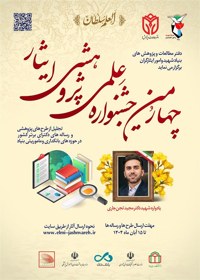به اطلاع پژوهشگران می رساند، اداره کل دفتر مطالعات و پژوهش های بنیاد شهید و امور ایثارگران در نظر دارد چهارمین جشنواره ملی علمی - پژوهشی ایثار، یادواره شهید تجن جاری را با موضوع تجلیل از طرح های پژوهشی و رساله های دکتری برتر کشور در حوزه های بانکداری و ماموریتی برگزار نماید.